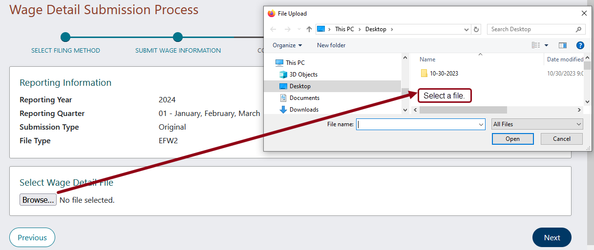 - The Wage Detail Submission Process page displays. Select the Filing Method: File Upload - Attach electronic wage file, and then select Next.