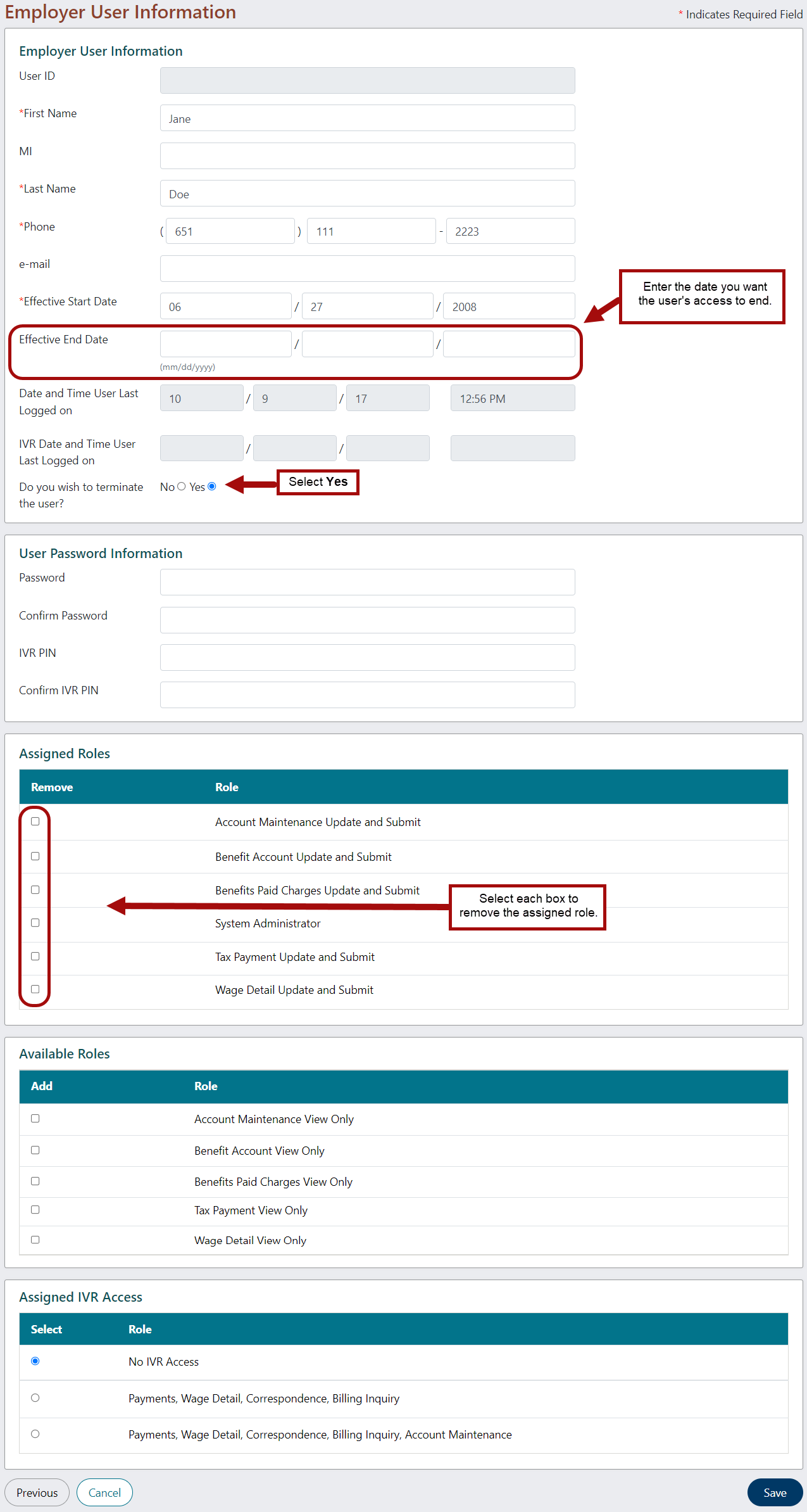 - In the Effective End Date field, enter the date you want the user's access to end. (See example)